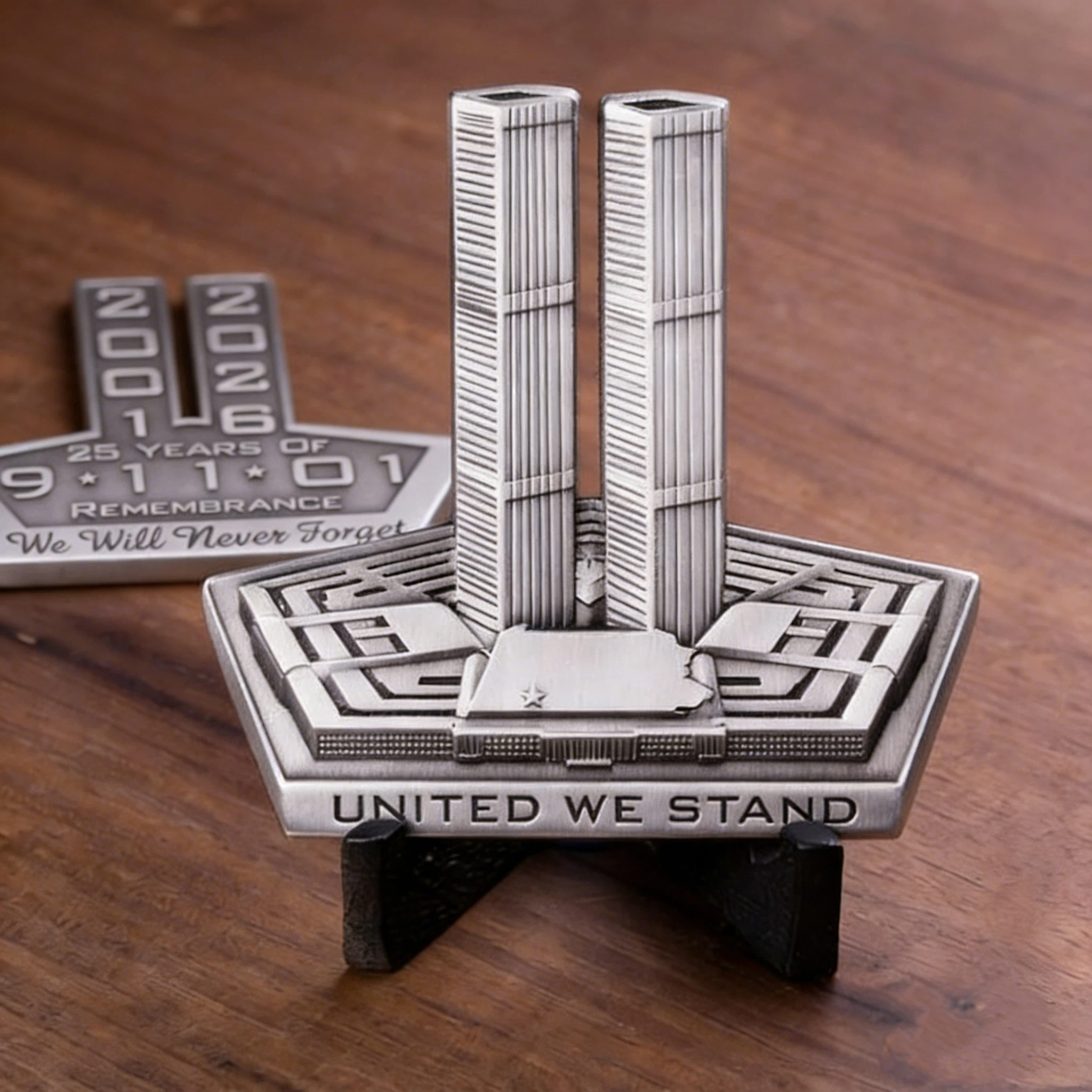 Iconic 3D Relief: The front features a meticulously sculpted 3D Twin Towers rising from the Pentagon-shaped base, capturing the skyline that defined a generation. Below, the rallying cry “UNITED WE STAND” echoes the unity that emerged in the aftermath.