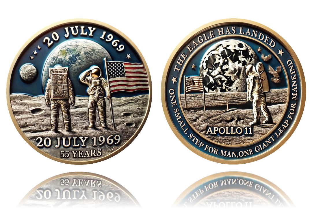Celebrate the 55th anniversary of the historic Apollo 11 Moon Landing with this beautifully crafted NASA challenge coin. Designed for collectors, space enthusiasts, and history buffs alike, this coin honors the bravery, innovation, and determination that made the first Moon landing on July 20, 1969, possible.