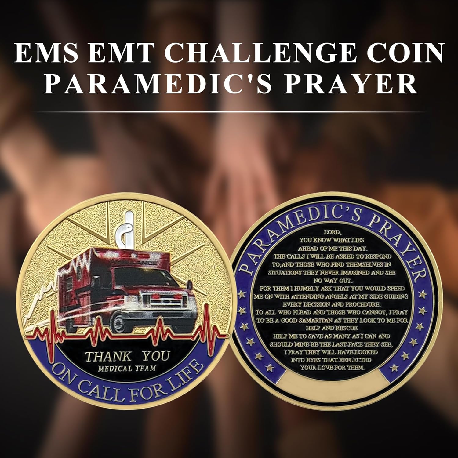 - Front Side: Features an ambulance superimposed on a heartbeat rhythm, symbolizing critical medical care. The phrases "THANK YOU" and "ON CALL FOR LIFE" honor the unwavering commitment of EMS teams.